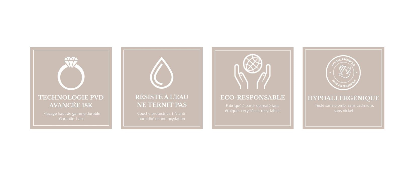 Chaque bijou est conçu à partir de matériaux haut de gamme, résistants à l’eau, hypoallergéniques et respectueux de l’environnement pour allier beauté, fiabilité et conscience. "