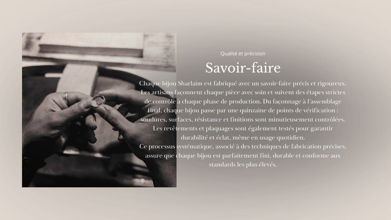 Grâce à ces qualités, chaque bijou Sharlaim allie élégance, durabilité et confort, te permettant de le porter au quotidien en toute sérénité, sans crainte d’oxydation, de noircissement ou d’irritation.